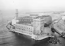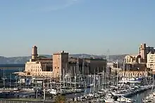 Vue depuis le fort Saint-Nicolas. De gauche à droite : tour du fanal, bâtiment G.H. Rivière, galerie des officiers, tour du roi René.