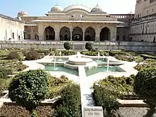 Le Jas Mandir ou salle des audiences privées décorée d'incrustations de verre et de bas-reliefs en albâtre est également situé dans cette enceinte[4].