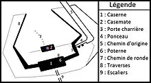 L'édifice comporte un plan polygonal (voir la section à ce sujet), et avait à l'origine une traverse[Note 2] centrale qui était entourée d'un mur d'escarpe à créneau de pied[Note 3], ainsi qu'un fossé en une contrescarpe en terre[18]. De plus, un chemin de ronde protégé grâce à un parapet à meurtrières verticales venait achever ce mur d'escarpe[18]. La caserne, établie sur deux étages, donne directement sur la ville et permettait de fermer l'ouvrage tout en surplombant la rivière du Doubs[18]. La partie basse de cet ouvrage est percée de meurtrières et l'étage aux fenêtres hautes et rectangulaires s'ouvre grâce à une porte qui donne sur la cour intérieure[18]. Le toit, construit en terrasse, est protégé par un mur en parapet à créneaux[18].