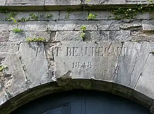 La porte de l'édifice est quant à elle dominée par une bretèche en saillie de style médiéval[14], et une poterne permet de rejoindre le niveau naturel grâce à une volée d'escaliers courbes, adjacents à un autre escalier droit permettant de descendre jusqu'au Doubs[18]. Le bâtiment est accessible par une porte charretière[Note 4] qui comporte l'inscription fort Beauregard — 1848 à l'extérieur, située dans le mur sud après avoir franchi le fossé[18]. On pouvait traverser ce dernier grâce à un ponceau d'où l'on peut voir deux anciennes piles[18], aujourd'hui réaménagé en petite passerelle. Le fossé dans sa face, ainsi que la cour intérieure jusqu'au niveau supérieur des parapets, ont été comblés afin de réaliser un jardin[18].
