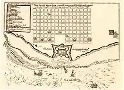 « ...[la ville] possède un petit fort de terre dominant le fleuve, cerné par un fossé, doté de dix canons de fer, dont le plus gros est de calibre douze. Là réside le gouverneur, et la garnison se compose de 150 hommes seulement, répartis en trois compagnies, commandées par trois capitaines nommés par celui-là selon sa convenance[2]... »