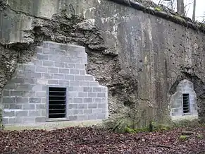 Les forts belges faisant peu de provisions par rapport aux besoins quotidiens d'une garnison en temps de guerre et les latrines, douches, cuisines et morgue se retrouvant dans la contrescarpe, les rendaient intenables pendant des combats. Cela aura des conséquences importantes sur la capacité des forts à résister à un assaut de longue durée. La zone de service était placée en face des baraquements qui donnaient sur le fossé à l'arrière du fort (dans ce cas, en direction de Namur) et qui bénéficiaient d'une protection moindre que le front ou les saillants[1]. Les forts conçus par Brialmont possédaient le côté arrière plus faiblement défendu pour permettre une recapture par les forces belges et les commodités et les baraquements y étaient localisés, le fossé apportant lumière et ventilation aux espaces de vie. Au combat, les bombardements intenses rendaient le fossé arrière intenable et les forces allemandes surent profiter de cette faiblesse après avoir franchi l'espace entre 2 forts[2]. Les forts Brialmont étaient également conçus pour résister à un bombardement de canons de 21 cm[3]. Le sommet du massif central était épais de 4 m de béton non-armé alors que les murs de la caserne, jugés moins exposés, n'en faisaient que 1,5 m[4].