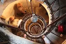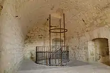 L'escalier à vis (XIXe) avec un monte-charge central descendant à 30 mètres sous terre relie la cour du donjon aux galeries souterraines décrites plus haut.