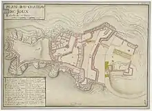 En 1668, pour récupérer la dot de son épouse (Marie-Thérèse, héritière de la Franche-Comté), Louis XIV prend en personne la Franche-Comté avec ses chevau-légers et ses gardes suisses qui ne servent normalement qu'à sa protection rapprochée et à celle de sa famille. Il envoie le général de Noisy (Louis de Maupeou, marquis de Noisy[13]) pour prendre Joux. Le baron Ferdinand de Saint-Mauris qui commande la garnison, composée de 60 soldats plus 20 cavaliers et 200 hommes de milices, est sous l'autorité du gouverneur de la province qui n'est autre que Philippe de la Baume-Saint-Amour, marquis d'Yenne. Celui-ci a été accusé d'avoir pris parti pour la France au mépris de son devoir de défendre les places franc-comtoises. Il capitule très vite devant de Noisy venu avec moitié moins d'hommes, mais défendu essentiellement par des miliciens peu aguerris et apeurés par les menaces de représailles du général français[14]. Sa trahison n'a pas été à ce jour confirmée et ce dernier s'en défendra toute sa vie[14]. Michaud, dans sa Biographie universelle ancienne et moderne, dépeint plutôt le personnage comme un homme d'honneur dépassé par le contexte et les événements et rejette l'hypothèse de la trahison. Cependant, Louis XIV est contraint de rendre la Franche-Comté à l'Espagne selon le traité d'Aix-la-Chapelle. Le baron de Saint-Mauris reste gouverneur de la place.