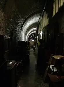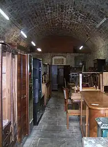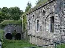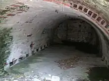 Un imposant puits à lumière, dont l'ouverture sommitale culmine à 10,50 mètres du sol et mesurant 6 × 2,5 mètres, est situé perpendiculairement à la cour et derrière les six ouvertures. Il amenait la lumière par une fenêtre située dans les deux magasins à poudre d'une dimension de 2 × 1,5 mètre[40]. Les locaux de stockage mesurant 12,5 × 6 mètres et ayant une contenance cumulée de 97 tonnes de poudre, possèdent une voûte en arc segmentaire[Note 6] alignant sur un même plan trois créneaux à lampe[40]. Entre ces magasins et le couloir de circulation est bâti un magasin à cartouches, ainsi que quatre auges en pierre appartenant à ce qui semble être une écurie[40]. Les dessus du réduit ne sont coiffés que de parapets d'infanterie qui ne sont pas organisés en position d'artillerie, et aucune rampe ne permet d'y mettre des canons[40]. Cependant, deux débouchés mènent à l'intérieur du fort, servant de point de communication entre les soldats postés au-dessus du fort et ceux en dessous ainsi que d'abris de parapet[41]. Chaque flanc du fort disposait également de deux banquettes d'infanterie[41],[Note 7]. Le couloir de circulation révèle au sol des traces de culot d'obus à certains endroits[40]. L'état de conservation général du fort est jugé satisfaisant par les spécialistes Marco Frijns, Luc Malchair, Jean-Jacques Moulins et Jean Puelinckx[40].