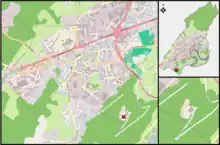 La batterie de mortiers de Planoise (parfois appelée également batterie centrale) est située au milieu du plateau que forme la place, à 480 mètres d'altitude[42]. Elle fut achevée en 1881, et elle est la seule batterie du genre car réalisée en fonction du mortier 200 mm de Bange MIe 1880 et MIe 1881[Note 8] ayant une portée maximale de 7 100 mètres, pouvant ainsi être fort utile même dans les angles morts formés par les méandres du Doubs[42]. Elle est composée d'une ligne paradossée[Note 9] de trois traverses-abris[Note 10] (chambre I, chambre II et chambre III) implantés parallèlement à une cinquantaine de mètres en avant de l'abri caverne de la carrière[42]. La chambre III est jouxtée par un local (chambre III bis) unique qui servait vraisemblablement au personnel, de dimension 4 × 3,5 mètres[42]. Les chambres II et III sont dissociées en trois parties cloisonnées percées de deux petites fenêtres[42], alors que la chambre I est quant à elle séparée en deux parties[42]. On note la présence d'un petit local au-delà du bras de la chambre I.