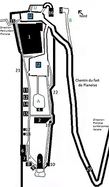 L'entrée de l'enveloppe[Note 3], qui est située sur les glacis à hauteur du front I-II du réduit, ne possède aucune défense excepté un parapet d'infanterie qui coiffe le sommet de l'escarpe attachée au réduit[12]. Aucun corps de garde n'existe à Planoise, certainement du fait que la batterie de Rosemont avait un large panorama sur les routes d'accès au fort[12]. Quasiment tous les ouvrages sont libres d'accès, sauf le fort en lui-même occupé par Emmaüs et la batterie nord-ouest accueillant l'antenne qui est fermée[12]. La complexité et le nombre des ouvrages composant la place fortifiée de Planoise font parfois penser à un centre de résistance, voire un véritable môle défensif[12]. Au total, ce sont 22 ouvrages qui composent le site de Planoise, répartis en huit grandes batteries.