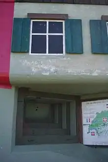 Vue du bloc d'infanterie 7 camouflé en bosquet de sapin et d'un fortin d'infanterie autonome (contre-ouvrage) camouflé en maison | |||