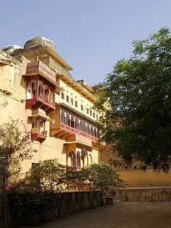 À l'intérieur de ces murailles, le palais du maharaja à plusieurs étages et au décor assez simple[réf. souhaitée], possède des plafonds peints et des jalis de pierre.