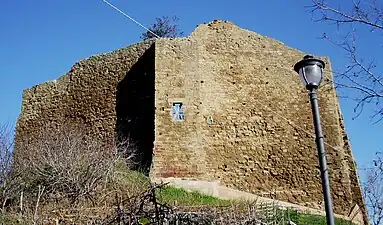 Les structures murales, entièrement recouvertes de pierre, sont insérées parmi les restes de quelques tours à section quadrangulaire et à base inclinée ; à différentes hauteurs, ils présentent une série de petites meurtrières en forme de carré. Il convient de noter une fenêtre à lancette unique bien conservée avec un arc en plein cintre, qui évoque les éléments stylistiques romans d'origine.