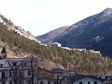 La forteresse de Fenestrelle, souvent appelée à tort « fort de Fenestrelle »; est en réalité une succession de trois forts et de sept redoutes, reliés entre eux par deux voies de communications, un escalier interne, « l'escalier couvert » de 4 000 marches, et un escalier externe de 2 500 marches, « l'escalier Royal ». La structure s'étire sur plus de 3 km et s'étage sur 635 m couvrant une superficie de 1 350 000 m2[11].