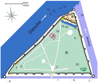 La forteresse est encerclée par 1,5 kilomètre de murs crénelés d'une épaisseur de 2 mètres et 25 tours de 25 mètres de haut. Deux de ses côtés bordent le Danube et la Jezava, si ce n'est qu'aujourd'hui la Jezava a été légèrement détournée et s'écoule un peu à l'écart des murs. Le troisième côté possède deux fossés qui furent ajoutés au système défensif, un pour la petite ville, l'autre pour le faubourg. La zone sud des murs extérieurs est resté ouverte.