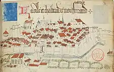 - Les fortifications ont été précédées par une première enceinte presque circulaire dont le centre correspondait à l’actuelle place Marcel Sembat, à l’est de la ville. Cette première enceinte enserrait le château. Elle fut partiellement détruite en 1633. Le carrefour en limite sud de ce cercle correspond probablement à une porte d’enceinte disparue[3]. Une porte fortifiée se situe également devant l’église, à l’ouest du château.