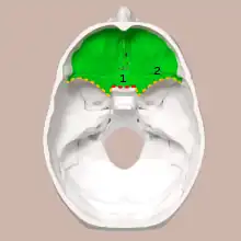 - le foramen caecum, entre l'os frontal et la crista galli dans lequel passe généralement une petite veine de la cavité nasale vers le sinus sagittal supérieur ;