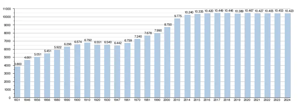 Elle comptait, au , 10 423 habitants (5 151 hommes et 5 272 femmes), soit une densité de 164,63 habitants/km²[3] pour une superficie de 63,31 km².