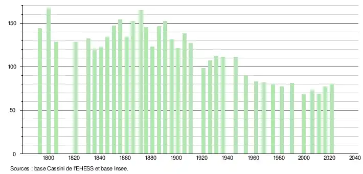 L'évolution du nombre d'habitants est connue à travers les recensements de la population effectués dans la commune depuis 1793. Pour les communes de moins de 10 000 habitants, une enquête de recensement portant sur toute la population est réalisée tous les cinq ans, les populations légales des années intermédiaires étant quant à elles estimées par interpolation ou extrapolation[28]. Pour la commune, le premier recensement exhaustif entrant dans le cadre du nouveau dispositif a été réalisé en 2006[29].