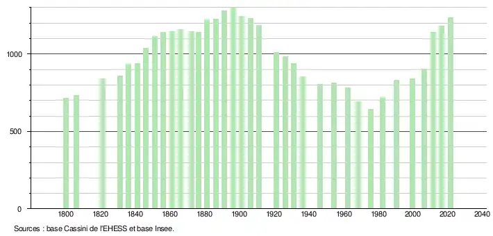 L'évolution du nombre d'habitants est connue à travers les recensements de la population effectués dans la commune depuis 1800. Pour les communes de moins de 10 000 habitants, une enquête de recensement portant sur toute la population est réalisée tous les cinq ans, les populations légales des années intermédiaires étant quant à elles estimées par interpolation ou extrapolation[18]. Pour la commune, le premier recensement exhaustif entrant dans le cadre du nouveau dispositif a été réalisé en 2006[19].