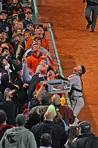 Le receveur Gregg Zaun s'approche des gradins dans l'espoir d'attraper la fausse balle.