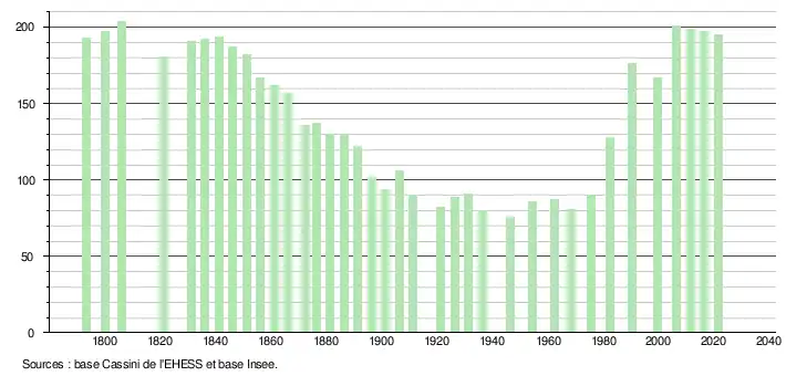 L'évolution du nombre d'habitants est connue à travers les recensements de la population effectués dans la commune depuis 1793. Pour les communes de moins de 10 000 habitants, une enquête de recensement portant sur toute la population est réalisée tous les cinq ans, les populations légales des années intermédiaires étant quant à elles estimées par interpolation ou extrapolation[27]. Pour la commune, le premier recensement exhaustif entrant dans le cadre du nouveau dispositif a été réalisé en 2006[28].
