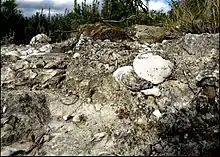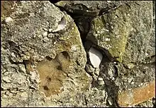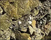 En outre, les fouilleurs n'ont pas signalé la plus remarquable des originalités du site observée pour la première fois en Languedoc (2018) par André Lopez[2] : le mortier de ses murs, dont les blocs sont du grès, renferme une quantité extraordinaire de coquilles de mollusques lamellibranches, surtout Cardium et Tapes, à valves entières. Elles y ont été incluses en désordre et sans but ornemental par les maçons antiques (Fig.1 à 3), remplaçant peut être ainsi le gravier. Il se pourrait que les coquillages, dont des Pectens ne font pas partie, aient été ramassés pêle-mêle avec du sable sur la plage proche en vue de la préparation du mortier…