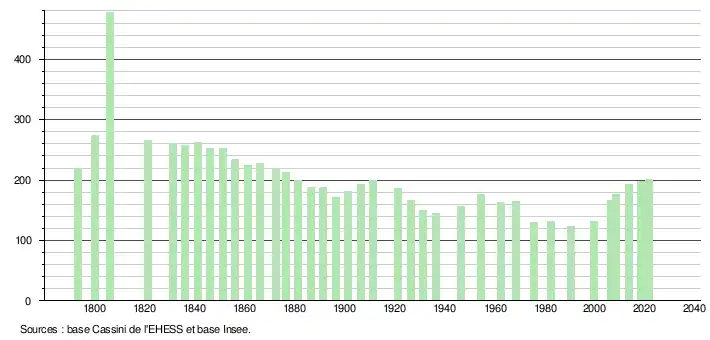 L'évolution du nombre d'habitants est connue à travers les recensements de la population effectués dans la commune depuis 1793. Pour les communes de moins de 10 000 habitants, une enquête de recensement portant sur toute la population est réalisée tous les cinq ans, les populations légales des années intermédiaires étant quant à elles estimées par interpolation ou extrapolation[33]. Pour la commune, le premier recensement exhaustif entrant dans le cadre du nouveau dispositif a été réalisé en 2008[34].