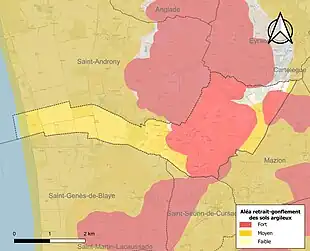 Le retrait-gonflement des sols argileux est susceptible d'engendrer des dommages importants aux bâtiments en cas d’alternance de périodes de sécheresse et de pluie. 94,3 % de la superficie communale est en aléa moyen ou fort (67,4 % au niveau départemental et 48,5 % au niveau national). Sur les 150 bâtiments dénombrés sur la commune en 2019, 145 sont en aléa moyen ou fort, soit 97 %, à comparer aux 84 % au niveau départemental et 54 % au niveau national. Une cartographie de l'exposition du territoire national au retrait gonflement des sols argileux est disponible sur le site du BRGM[24],[Carte 2].