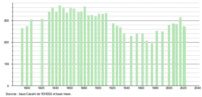 L'évolution du nombre d'habitants est connue à travers les recensements de la population effectués dans la commune depuis 1793. Pour les communes de moins de 10 000 habitants, une enquête de recensement portant sur toute la population est réalisée tous les cinq ans, les populations légales des années intermédiaires étant quant à elles estimées par interpolation ou extrapolation[30]. Pour la commune, le premier recensement exhaustif entrant dans le cadre du nouveau dispositif a été réalisé en 2005[31].