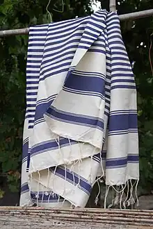Qu'on attache à la ceinture, en entrant dans le bain ou les hammams. Au XIVe siècle, Ibn Batouta dit en décrivant les hammams de Bagdad : « On donne à chacun qui entre le bain trois fouta, on sert de la première en guise de caleçon, en entrant dans le bain, de la seconde quand on sort, et avec la troisième en s'essuie le corps ».