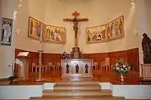Des fresques ont été peintes en juin 2007 et juin 2008, par Paolo Orlando, iconographe italien. Ces images représentent des figures de sainteté bibliques ou franciscaines. Dans le chœur ont été placées quatre scènes évangéliques de la miséricorde divine entourées par des saintes et des saints franciscains qui l’ont vécue, comme celle de la Brebis perdue (Luc 15). En haut de la fresque, le troupeau paît sur une montagne verdoyante et se repose. On y voit une des images du royaume, telle que l’évoque le psaume 22 : « Le Seigneur est mon berger : je ne manque de rien. Sur des prés d'herbe fraîche, il me fait reposer ». Le bas de la scène contraste avec son buisson épineux, signe d’aridité, et la caverne noire, symbole de la mort. Le pasteur, sous les traits du Christ, s’incline pour sauver la brebis perdue. Ses gestes sont humbles et tendres ; son regard plein de compassion et de miséricorde. Comme les Pères de l'Église l’ont bien saisi, la parabole est une évocation du Christ descendant aux enfers pour ramener Adam au paradis. De part et d’autre de la scène évangélique, deux prêtres qui passèrent de nombreuses heures au confessionnal : le curé d’Ars qui se tourne vers la croix et Léopold Mandic, capucin du XXe siècle qui vécut à Padoue.