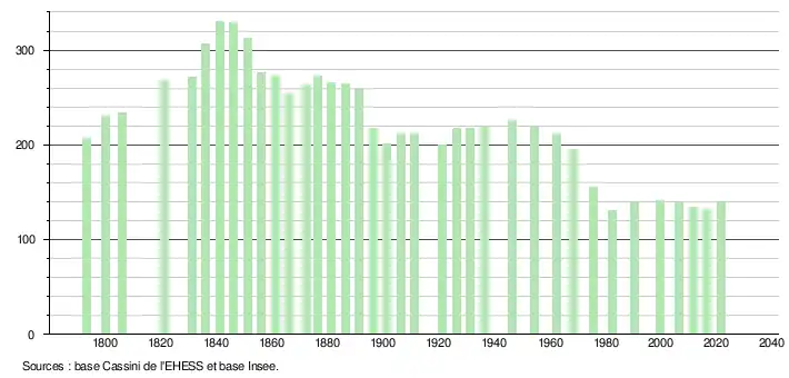 L'évolution du nombre d'habitants est connue à travers les recensements de la population effectués dans la commune depuis 1793. Pour les communes de moins de 10 000 habitants, une enquête de recensement portant sur toute la population est réalisée tous les cinq ans, les populations légales des années intermédiaires étant quant à elles estimées par interpolation ou extrapolation[18]. Pour la commune, le premier recensement exhaustif entrant dans le cadre du nouveau dispositif a été réalisé en 2006[19].