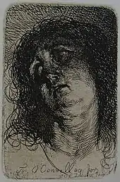 - « La bouche tremble d'un sanglot inapaisé, le cou se gonfle, les narines frémissent, le cou se contracte par l'effet des larmes qui ne peuvent point couler. C'est presque la répétition de la précédente, mais la main ne soutient plus la tête dolente, l'expression est plus passionnée, le cou s'attache avec plus de décision, et les chairs sont traitées avec bien autrement de franchise; c'est la plus belle pièce qu'ait gravée madame O'Connell. La crânerie de l'effet, la sûreté de la pointe font de ce croquis magistral une eau-forte digne des plus illustres Flamands. »