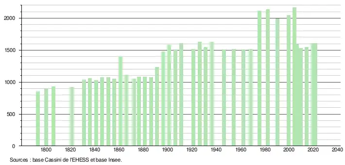 L'évolution du nombre d'habitants est connue à travers les recensements de la population effectués dans la commune depuis 1793. Pour les communes de moins de 10 000 habitants, une enquête de recensement portant sur toute la population est réalisée tous les cinq ans, les populations légales des années intermédiaires étant quant à elles estimées par interpolation ou extrapolation[26]. Pour la commune, le premier recensement exhaustif entrant dans le cadre du nouveau dispositif a été réalisé en 2004[27].