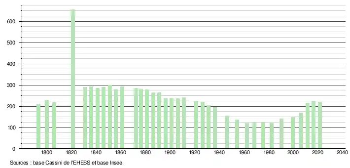 L'évolution du nombre d'habitants est connue à travers les recensements de la population effectués dans la commune depuis 1793. Pour les communes de moins de 10 000 habitants, une enquête de recensement portant sur toute la population est réalisée tous les cinq ans, les populations légales des années intermédiaires étant quant à elles estimées par interpolation ou extrapolation[22]. Pour la commune, le premier recensement exhaustif entrant dans le cadre du nouveau dispositif a été réalisé en 2006[23].