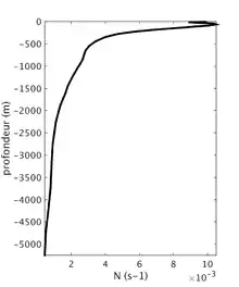 La variation de densité n'est pas linéaire selon la température (la densité maximale de l'eau non salée est à 4 °C et la densité change soudainement dans la couche de glace de surface, entre autres facteurs). Lorsqu'une particule de fluide est déplacée verticalement de manière adiabatique (c'est-à-dire sans que T et S ne soient modifiées) la variation de densité due à une variation de niveau est[7] :
