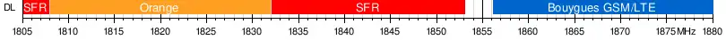 Bande LTE no 3 FDD[3],[4]. Cette bande de fréquence a une utilisation mixte 2G (GSM) et 4G (LTE)[8]. La technologie présente sur la bande varie localement selon les zones et il peut également y avoir les 2 technologies à la fois dessus.