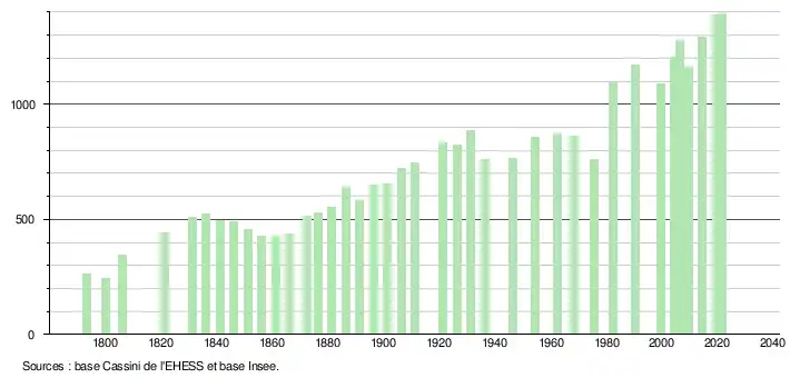 L'évolution du nombre d'habitants est connue à travers les recensements de la population effectués dans la commune depuis 1793. Pour les communes de moins de 10 000 habitants, une enquête de recensement portant sur toute la population est réalisée tous les cinq ans, les populations légales des années intermédiaires étant quant à elles estimées par interpolation ou extrapolation[44]. Pour la commune, le premier recensement exhaustif entrant dans le cadre du nouveau dispositif a été réalisé en 2004[45].