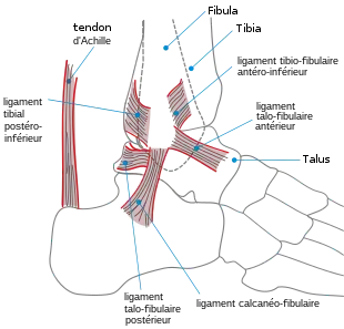 La région de la cheville fait référence à l'endroit où la jambe rencontre le pied (région talocrurale)[4]. L'articulation de la cheville est une articulation charnière complexe et fortement contrainte composée de trois os : le tibia, le péroné et le talus[5],[6]. L'aspect porteur du tibia le plus proche du pied (appelé plafond) se connecte avec le talus. Cette articulation (où deux os se rencontrent) est principalement responsable de la flexion plantaire (déplacer le pied vers le bas) et de la dorsiflexion (déplacer le pied vers le haut)[6]. Ensembles, le tibia et le péroné forment une douille en forme de support connue sous le nom de mortaise, dans laquelle s'insère le talus en forme de dôme[7]. Le talus et le péroné sont reliés par un groupe solide de ligaments, qui soutiennent la face latérale de la cheville. Ces ligaments comprennent le ligament talo-fibulaire antérieur (ATFL) et le ligament talo-fibulaire postérieur (PTFL)[8]. Le ligament calcanéo-fibulaire (LFC), qui relie le péroné au calcanéum, ou os du talon, fournit également un soutien latéral. Le ligament deltoïde soutient la partie médiale de la cheville (la plus proche de la ligne médiane). Il empêche le pied de s'éverser excessivement ou de se tourner vers l'extérieur, tout en empêchant également le talus de tourner vers l'extérieur[8]. Les parties distales du tibia et du péroné sont reliées par un réseau de tissu conjonctif appelé syndesmose, composée de quatre ligaments et de la membrane interosseuse[8].