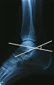 L'angle de Gissane, ou angle critique, est l'angle formé par les parties descendante et montante de la face supérieure du calcanéus. Sur une radiographie de profil, un angle de Gissane supérieur à 130° suggère une fracture de la surface postérieure du ligament talo-calcanéen. L'angle de Böhler, quant à lui, est l'angle ouvert vers l'arrière et constitué par le croisement d'une ligne qui longe la face supérieure de la grande tubérosité du calcanéus et d'une autre ligne qui joint le point le plus haut du calcanéus et le point le plus haut de la grande apophyse du calcanéus. Un angle inférieur à 20° suggère un enfoncement de la facette postérieure et une possible fracture de l'os.