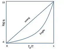 où η est la viscosité, Tg la température de transition vitreuse et T la température[3]. Les liquides vitrifiables de grande fragilité sont dits « fragiles », ceux de faible fragilité sont dits « forts »[4]. Par exemple la silice est « forte » tandis que certains polymères sont « fragiles »[3].