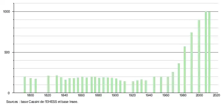 L'évolution du nombre d'habitants est connue à travers les recensements de la population effectués dans la commune depuis 1793. À partir du , les populations légales des communes sont publiées annuellement dans le cadre d'un recensement qui repose désormais sur une collecte d'information annuelle, concernant successivement tous les territoires communaux au cours d'une période de cinq ans. Pour les communes de moins de 10 000 habitants, une enquête de recensement portant sur toute la population est réalisée tous les cinq ans, les populations légales des années intermédiaires étant quant à elles estimées par interpolation ou extrapolation[2]. Pour la commune, le premier recensement exhaustif entrant dans le cadre du nouveau dispositif a été réalisé en 2007[3],[Note 1].