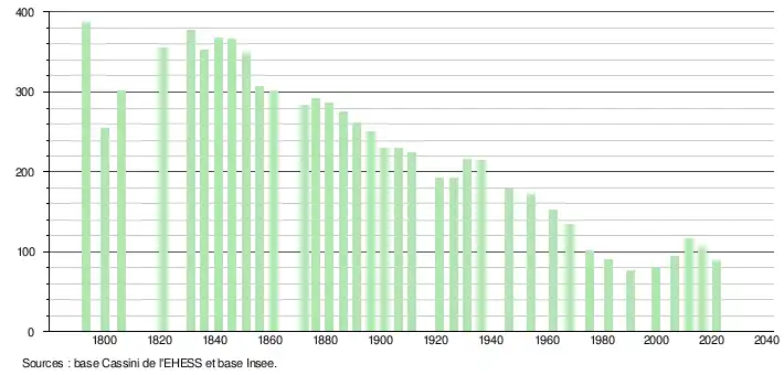 L'évolution du nombre d'habitants est connue à travers les recensements de la population effectués dans la commune depuis 1793. Pour les communes de moins de 10 000 habitants, une enquête de recensement portant sur toute la population est réalisée tous les cinq ans, les populations légales des années intermédiaires étant quant à elles estimées par interpolation ou extrapolation[18]. Pour la commune, le premier recensement exhaustif entrant dans le cadre du nouveau dispositif a été réalisé en 2006[19].