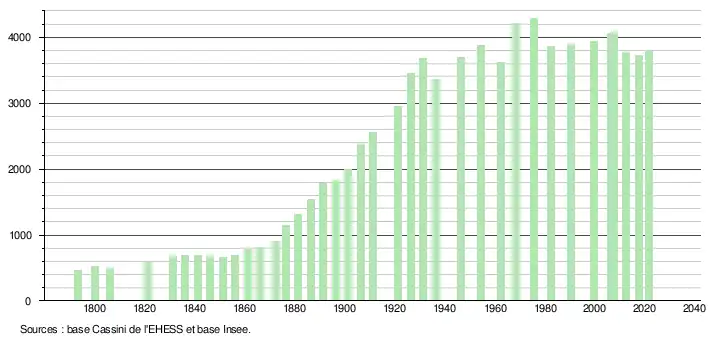 , la commune comptait 3 779 habitants. L'évolution du nombre d'habitants est connue à travers les recensements de la population effectués dans la commune depuis 1793. Une réforme du mode de recensement permet à l'Insee de publier annuellement les populations légales des communes à partir de 2006. Pour Fraisses, commune de moins de 10 000 habitants, les recensements ont lieu tous les cinq ans, les populations légales intermédiaires sont quant à elles estimées par calcul[22]. Les populations légales des années 2007, 2012, 2017 correspondent à des recensements exhaustifs[23].