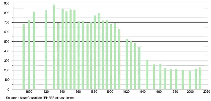 L'évolution du nombre d'habitants est connue à travers les recensements de la population effectués dans la commune depuis 1793. À partir du , les populations légales des communes sont publiées annuellement dans le cadre d'un recensement qui repose désormais sur une collecte d'information annuelle, concernant successivement tous les territoires communaux au cours d'une période de cinq ans. Pour les communes de moins de 10 000 habitants, une enquête de recensement portant sur toute la population est réalisée tous les cinq ans, les populations légales des années intermédiaires étant quant à elles estimées par interpolation ou extrapolation[3]. Pour la commune, le premier recensement exhaustif entrant dans le cadre du nouveau dispositif a été réalisé en 2006[4],[Note 1].