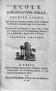 - L’école d’architecture rurale, ou Leçons par lesquelles on apprendra soi-même à bâtir solidement les maisons de plusieurs étages, avec la terre seule ou autres matériaux les plus communs et du plus vil prix, Paris : l’Auteur, 1790, 52 p. Texte en ligne ; Paris : l’Auteur, 1791, in-8°, 76 p. ; Lyon : l’École d’architecture rurale, 1796, in-8°, 110 p.