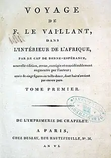 - [1790] Voyage de M. Le Vaillant dans l'Intérieur de l'Afrique par Le Cap de Bonne Espérance, dans Les années 1783, 1784 et 1785 (2 tomes : t. 1, Paris, libr. Leroy, 383 p. / t. 2, Paris / Liège, libr. Leroy / impr. Dumoulin, 292 p. / Cartes), .