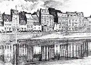 À son retour d'Italie, il revient habiter au quai de Maestricht[1], dans un logis de deux pièces qui n'a rien d'élégant et qui est installé au-dessus d'une guinguette. En y entrant, on voit une grosse presse dans un coin, une table d'encrage dans un autre coin, un brise-lumière face au jour, des classeurs d'estampes, des cartons un peu partout, des bibelots de Rome et enfin par les hautes baies vitrées, l'une de ses principales sources d'inspiration, la vie des quais et la Meuse[5].