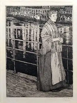 Maurice Kunel dépeint cette gravure en ces termes : « Sur le quai, longeant le parapet, une mégère. Elle porte le tablier des femmes du peuple. Un châle jeté sur ses épaules, à la mode wallonne, cache mal des appâts périmés. C'est une ruine. Dans ce visage s'ouvre une bouche malsaine et deux yeux veules, de leurs orbites tuméfiées, lancent aux passants des regards solliciteurs. Elle épie, s'offre et attend, journellement, invariablement… Et la Meuse clignote de tous ses reflets vers cette épave crépusculaire, et coule et coule et l'attend, journellement, invariablement… [5] »