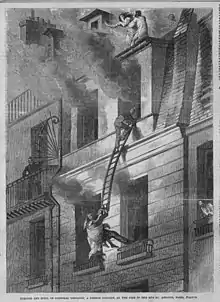 Le seul moyen d'accéder aux étages c'est avec un outil propre aux pompiers de Paris : l'échelle à crochets. C'est alors que le caporal Thibault s'élance avec courage sur son échelle et réalise dix sauvetages[4]. Le dernier étant le plus difficile et le plus dangereux, celui de la dame Folias au cinquième étage[5]. Il n'hésite pas une seconde et par une succession d'habiles mouvements de gymnastique, il parvient à la sauver[6].