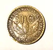 De 1924 à 1926, sont frappées par la Monnaie de Paris des pièces de 50 centimes, 1 franc et 2 francs en aluminium-bronze, avec comme motif la Marianne de Patey, et la mention Territoires sous mandat de la France - Cameroun[alpha 1]. À compter de 1943, la France libre fait frapper, par la Monnaie de Pretoria, une série de pièces de 50 centimes et 1 franc en bronze, aux motifs du coq et de la croix de Lorraine, et portant les mentions de Cameroun français, puis Cameroun français libre (1943). En 1948, dans le cadre de l'Union française, deux pièces en aluminium de 1 et 2 francs sont émises avec la mention Territoire du Cameroun. En 1958, l'Institut d'émission de l'Afrique-Équatoriale française fabrique une série de pièces en aluminium-bronze de 5, 10 et 25 francs avec la mention Cameroun à l'avers[2].
