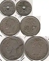 Les premières pièces furent frappées après 1909 sous le règne d'Albert. Les pièces d'une valeur inférieure à 50 centimes sont trouées. La première série de pièces courantes comprend des pièces de 1 et 2 centimes en bronze ; de 10, 20, 50 centimes et 1 franc en cupronickel. Une deuxième série comprend une pièce représentant Léopold III, d'une valeur de 5 francs, en laiton. La troisième série, de 1943 à 1949, au motif de l'éléphant, comprend des pièces de 1, 2, 5 et 50 francs, cette dernière est en argent.